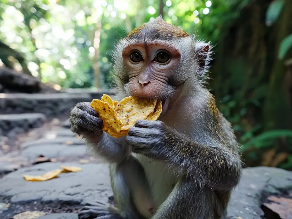 大胆なサルが近くにいた観光客からポテトチップスの袋を奪うと、彼は思わず笑みを浮かべた。観光客は笑いながら写真を撮り、サルは木に登って高い枝に落ち着いた。ポテトチップスのカリカリという音が空中に響き渡り、サルは生意気にも満足げに下を向いてその値段を楽しんでいた。