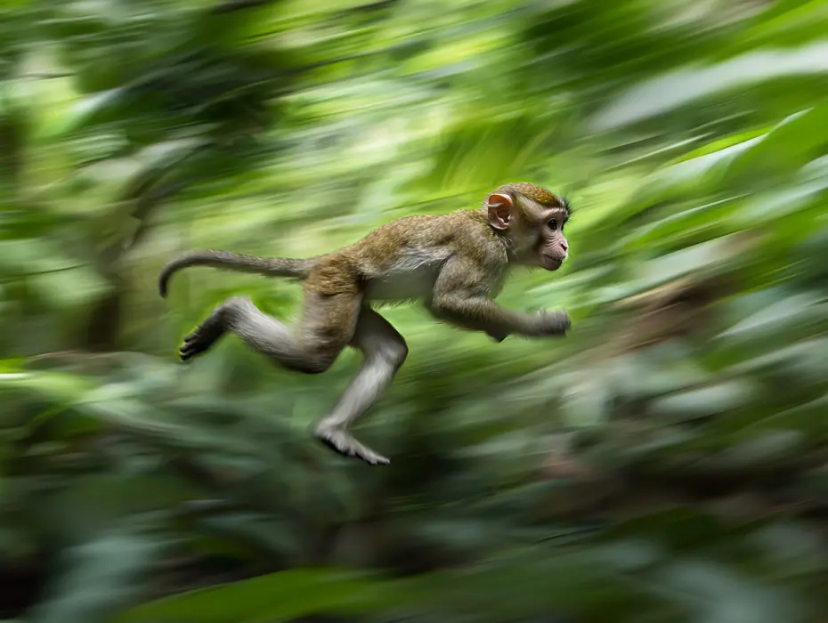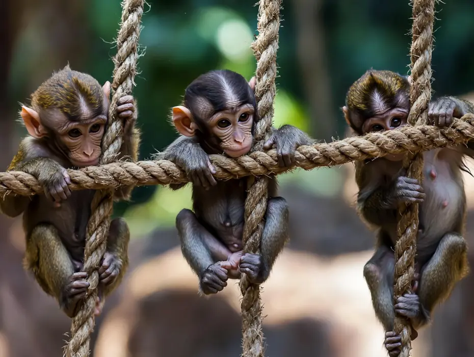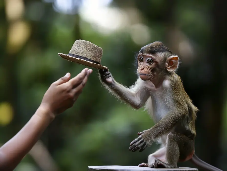 もう一匹の猿が蔓から急降下し、目をいたずらっぽく輝かせた。石道を横切り、子供の頭から色鮮やかな帽子をひったくった。その帽子は猿の小さな体には大きすぎたが、小さな泥棒は躊躇しなかった。