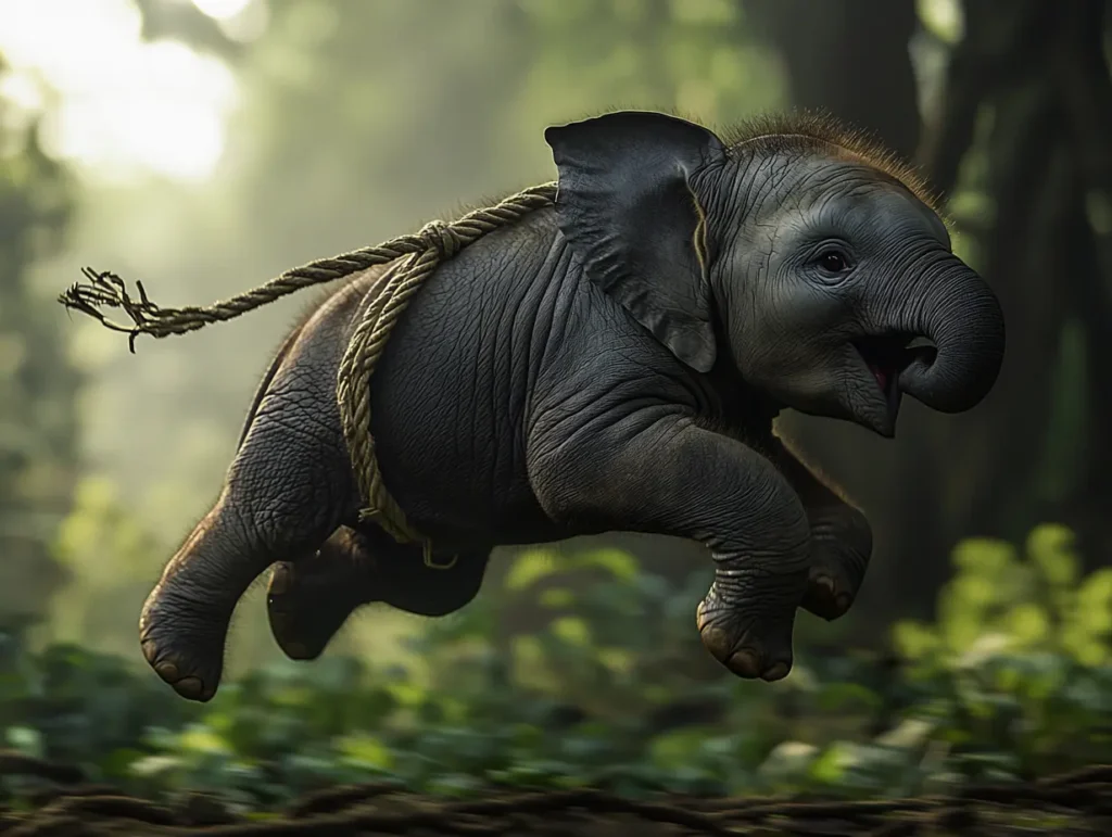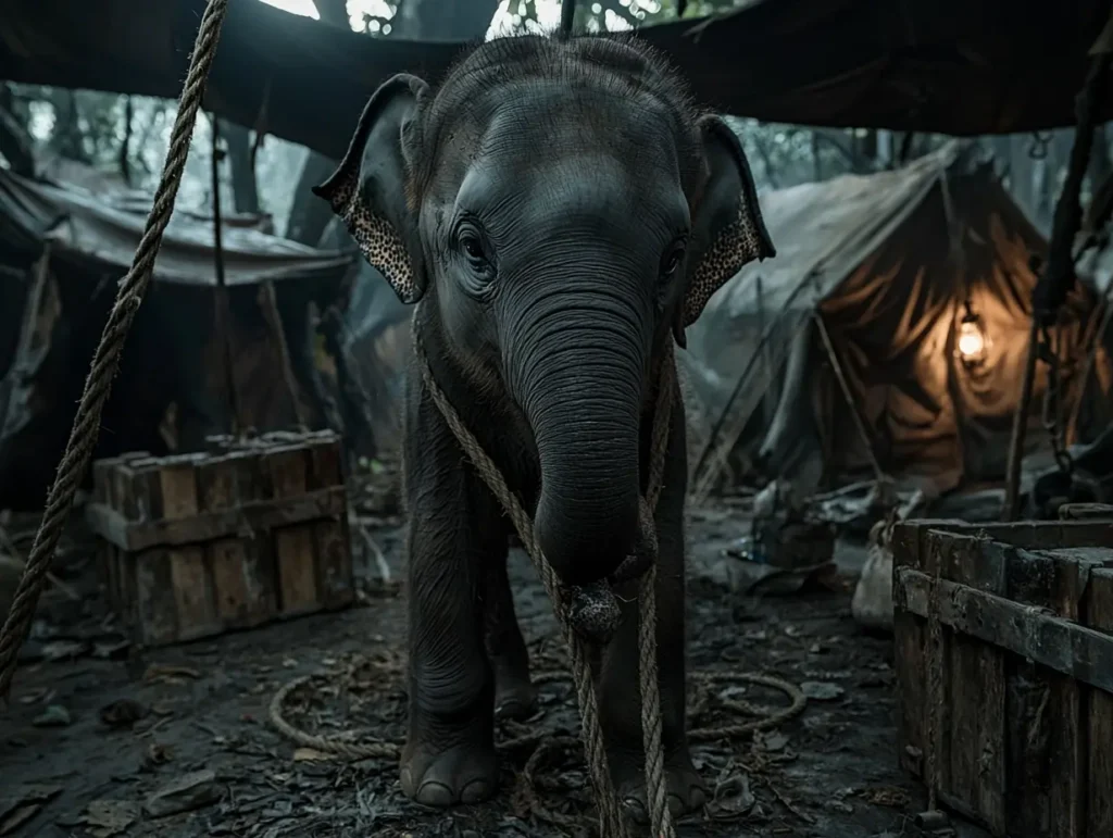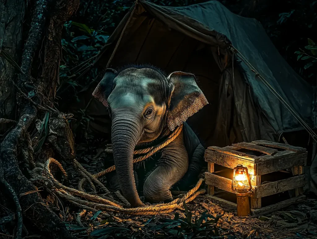 アマラの視線はテントから、空き地の端にある影に注がれた。彼女は息をのどにつかえた。太いロープで地面の杭につながれた子ゾウは、薄明かりの中で小さく震えていた。子象の目は恐怖で大きく見開かれ、自由になろうと必死だった。