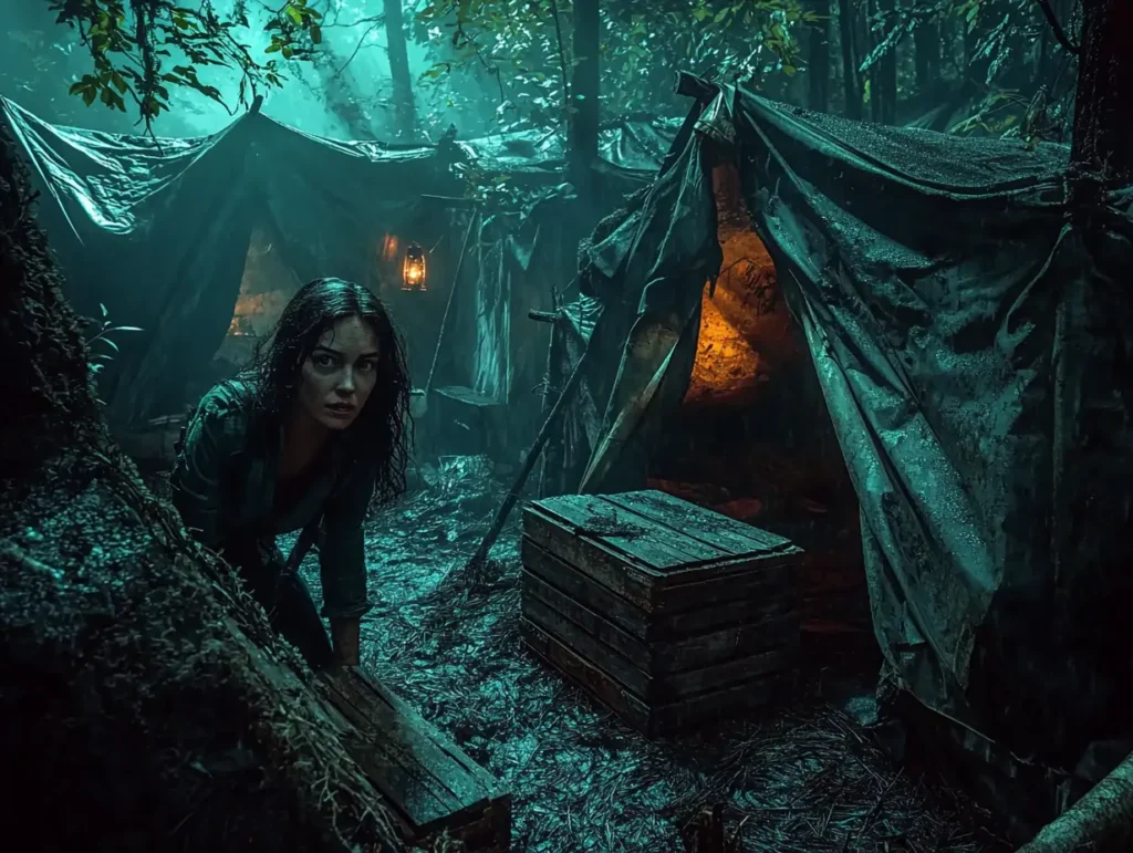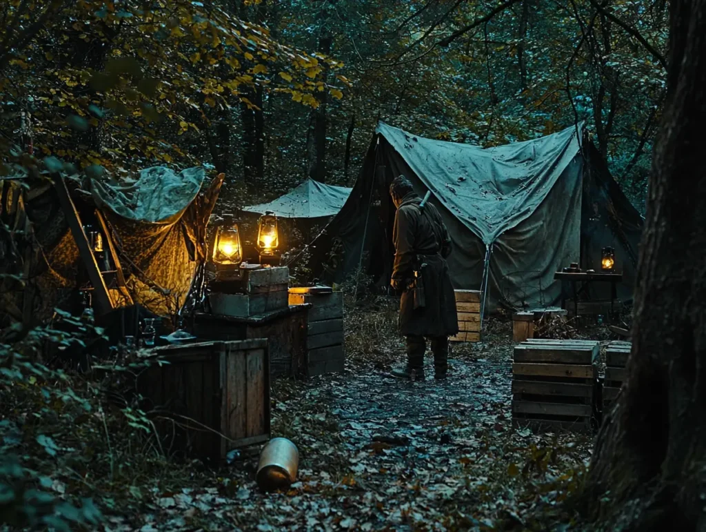 突然、木々が開いて小さな空き地が現れた。ぼろぼろに風化し、散乱した木箱や金属製の罠に囲まれた荒廃したテント。散乱した木箱や金属製の罠に囲まれていた。