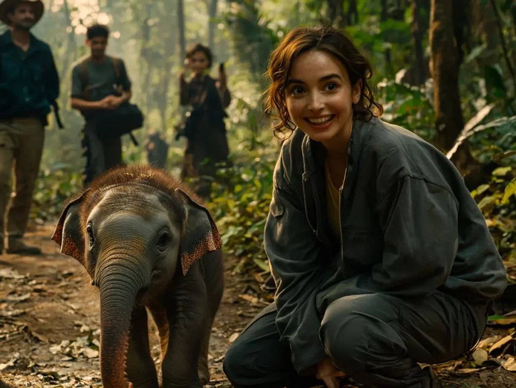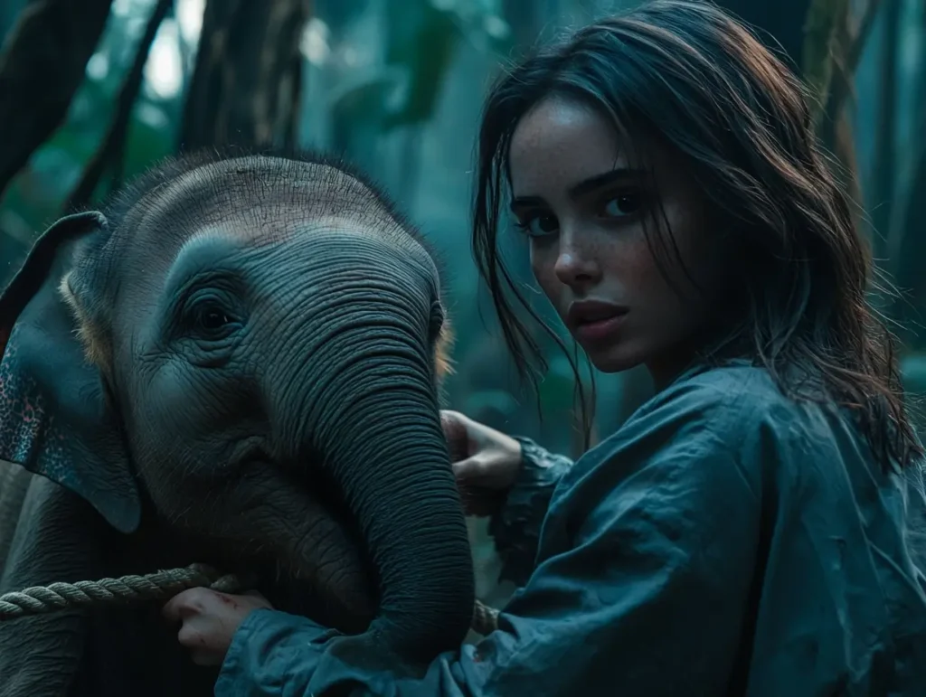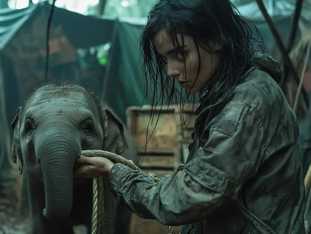 彼女は跪き、疲労が重くのしかかる中、子象に手を差し伸べた。子象は彼女のそばに寄り添い、小さな幹を伸ばして彼女の手に触れ、安堵を分かち合う仕草を見せた。