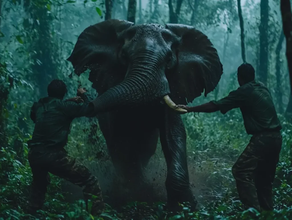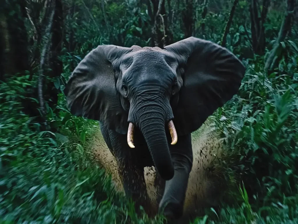 耳をつんざくようなトランペットを鳴らし、鳥たちを宙に舞い上がらせ、密猟者たちをその場に凍りつかせた。「何なんだ……」一人の男が言いよどみ、その声は象の獰猛な咆哮にかろうじて聞こえた。しかし、彼に言い終わるチャンスはなかった。象は突進し、その巨大な体躯は止めようのない勢いで彼らに向かって突進してきたのだ。