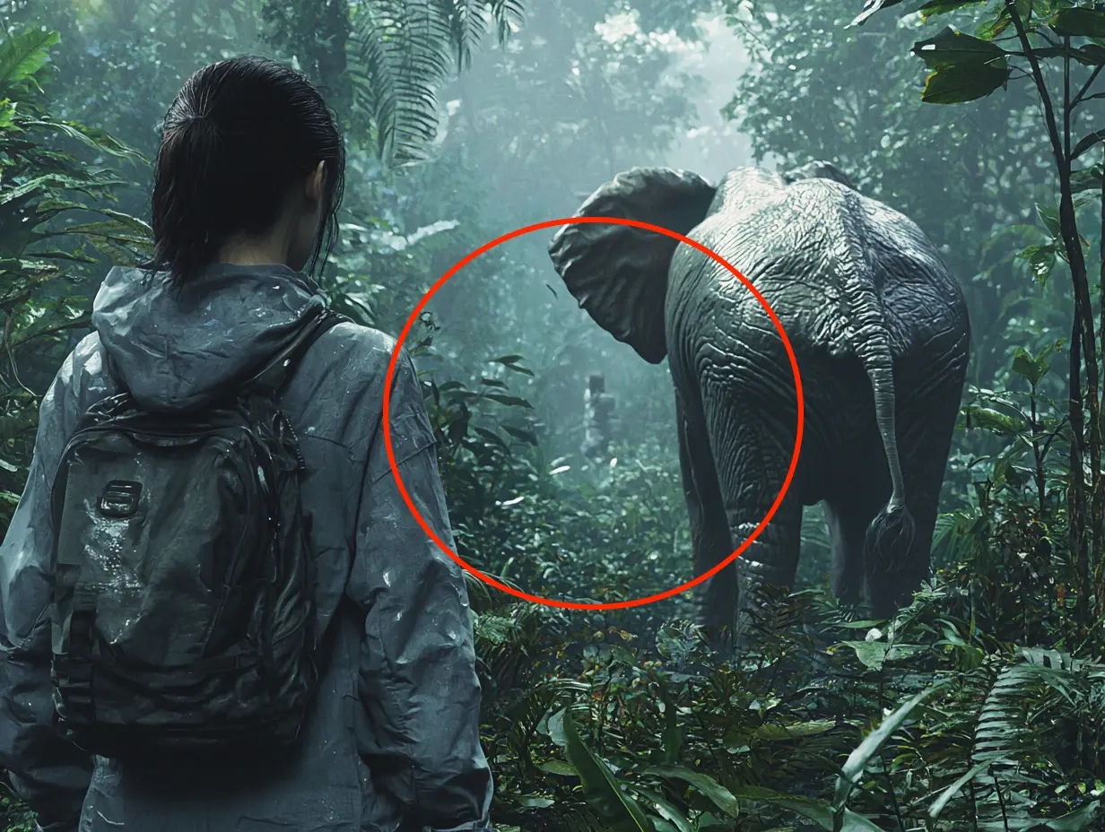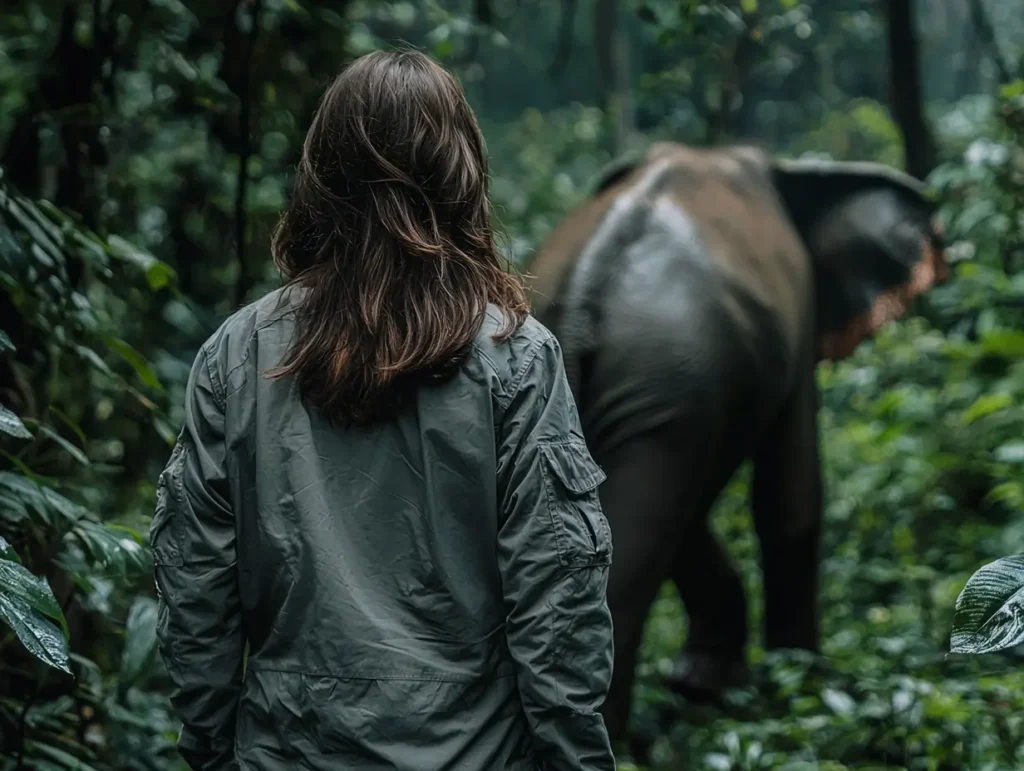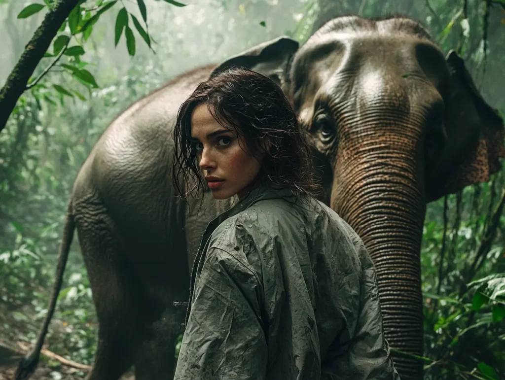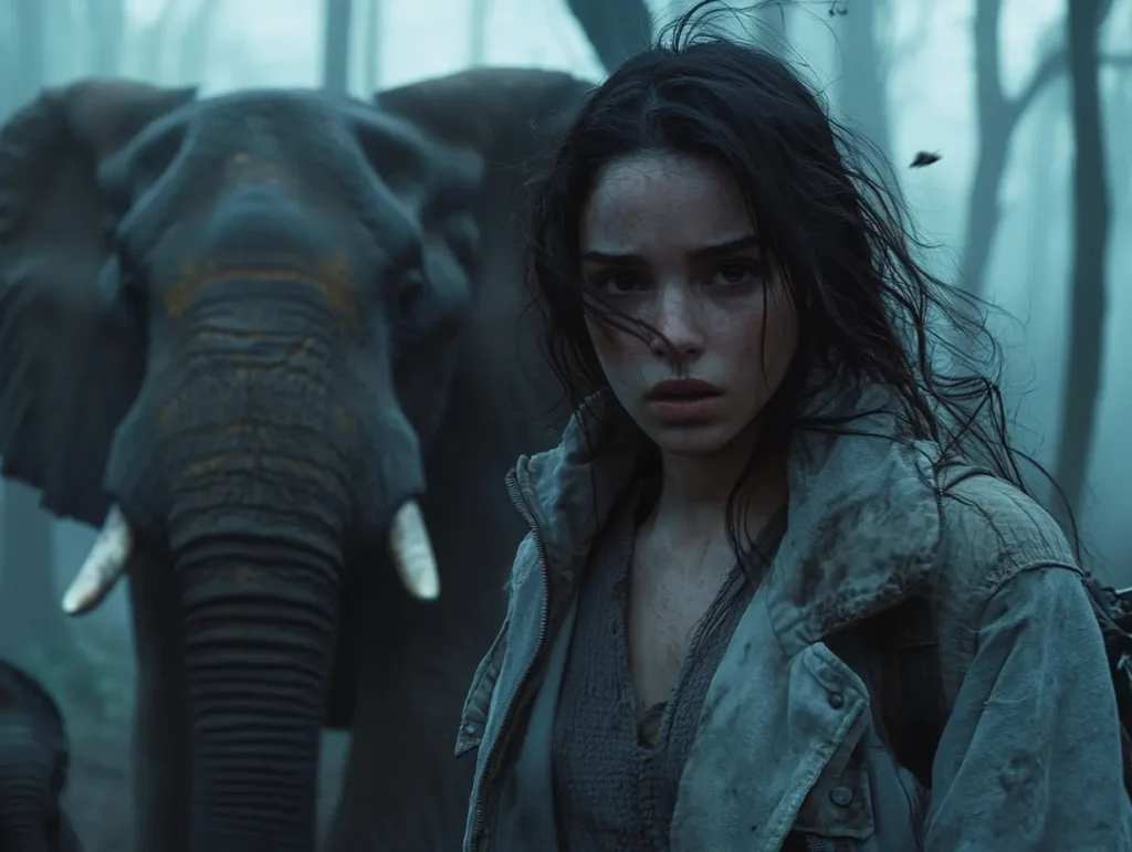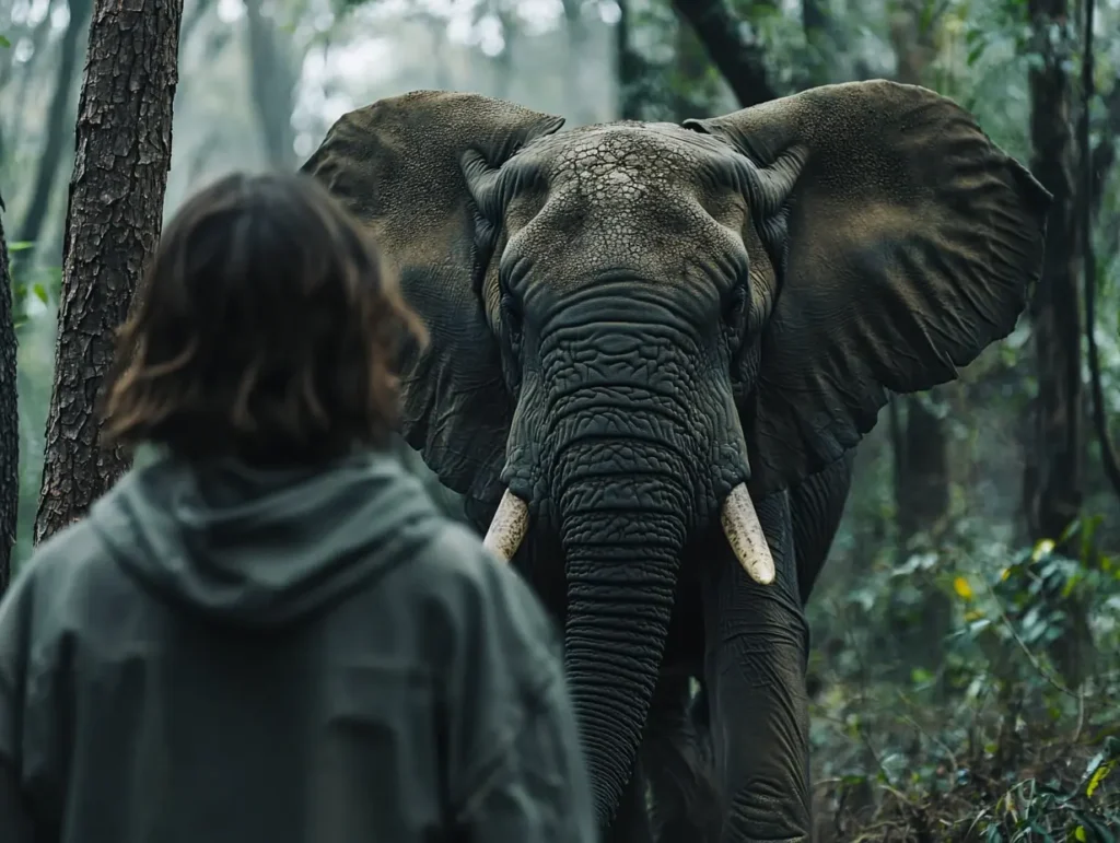 凍りついたアマラは木に押しつけられ、あまりの恐怖に息をすることさえできなかった。観光客たちは何の考えもなしに逃げ出し、彼女ひとりが獣と対峙することになった。象はゆっくりと彼女に視線を向け、その力強いトランクを彼女の肩の近くまで下げた。アマラの心は逃げろと叫んだが、足は従わなかった。